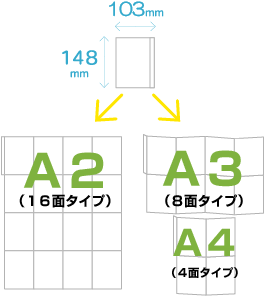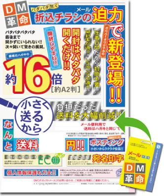 DMが届いた際にはハガキサイズですが、開封すると最大約A2サイズにまで展開。非常にインパクトのある形状ですので、DMを受け取った人の興味を惹きます。もちろん封筒レスの圧着DMですから、開封にハサミ等は必要ありません。 約A2サイズのワイドな紙面に情報を掲載することが可能です。B3サイズの折込チラシの内容を載せることも可能ですし、通常のDMでは載せきれない商品やサービスを多数紹介することや、イベントの告知や新商品の情報などに最適です。圧着されたサイズはハガキ大でコンパクト。投函もしやすく、ポスティングツールとして最適です。
