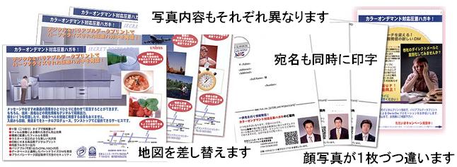 「モノクロ」の可変印刷は多くの印刷会社が対応できますが、「フルカラー画像の可変」となりますと、設備、プログラミング技術、オペレーターの経験などが必要です。多くの事例を積み重ねながら、データロードは「フルカラー可変印刷」に本格参入いたします。たとえば宛名印字をしながら印刷内容をカラーで変えて印刷できますので、その送付先様のみに訴求する特別なダイレクトメールをカラーで作ることが可能です。